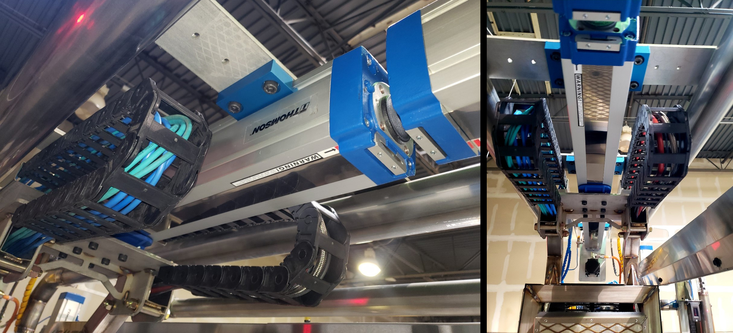 兩個(gè)垂直安裝的Thomson M100直線運(yùn)動(dòng)系統(tǒng)隨著固化系統(tǒng)前后移動(dòng),并上下移動(dòng)裝有頂置加熱器的吊桿。兩個(gè)Thomson MG07直線模組水平安裝,以引導(dǎo)百葉窗運(yùn)動(dòng),使紅外燈傾斜以實(shí)現(xiàn)最大覆蓋范圍,并避開(kāi)后視鏡等突出部件。還有兩個(gè)額外的Thomson M100直線模組垂直安裝,以控制攝像機(jī)的上下運(yùn)動(dòng),監(jiān)測(cè)車(chē)輛尺寸并將定位數(shù)據(jù)發(fā)送到運(yùn)動(dòng)控制組件。