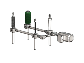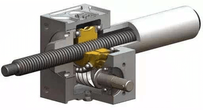 精密蝸輪傳動(dòng)裝置(蝸桿軸與內(nèi)螺紋蝸輪)的旋轉(zhuǎn)運(yùn)動(dòng)被轉(zhuǎn)換成絲杠的軸向直線運(yùn)動(dòng)(絲杠穿過(guò)齒輪箱外殼),負(fù)載安裝在絲杠的端部。