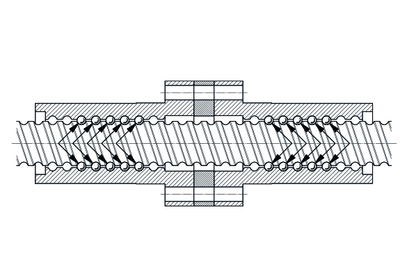 另一種方法是使用可調(diào)節(jié)預加載的滾珠螺母。這種方法使用中間帶彈簧組件的兩個滾珠螺母。彈簧組件將一個滾珠螺母推向絲杠滾道左側(cè),將另一個滾珠螺母推向絲杠滾道的右側(cè)。通過調(diào)節(jié)螺母間彈簧張力的螺紋環(huán),可以根據(jù)具體應用微調(diào)預加載力。該方法還允許單獨購買螺母和絲杠,同時仍然實現(xiàn)預加載。